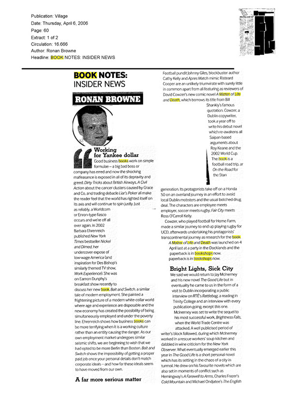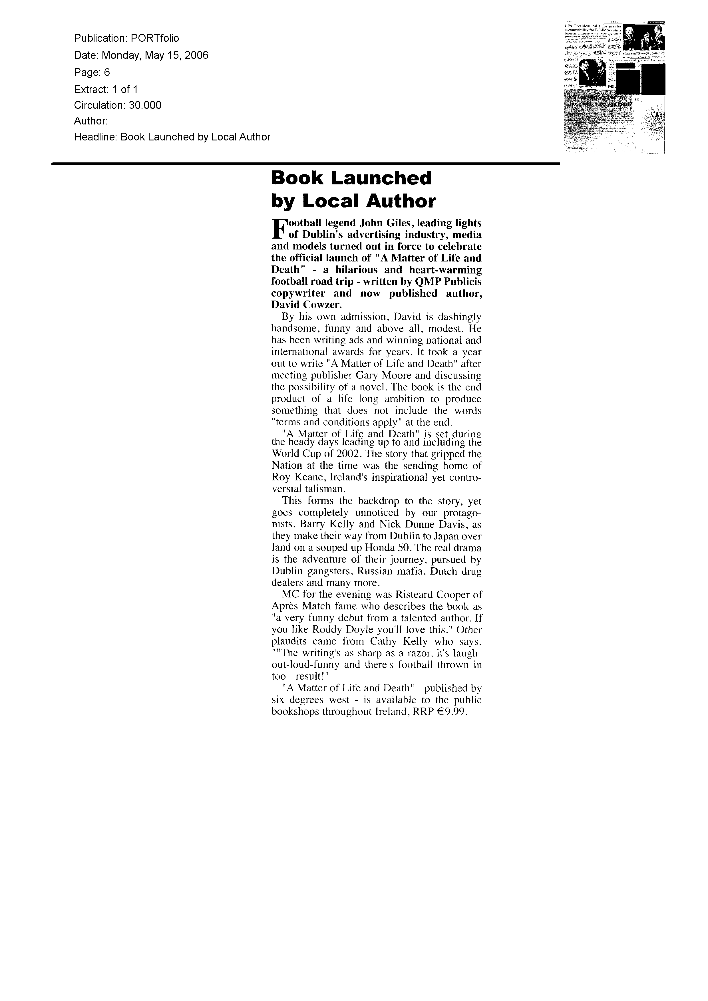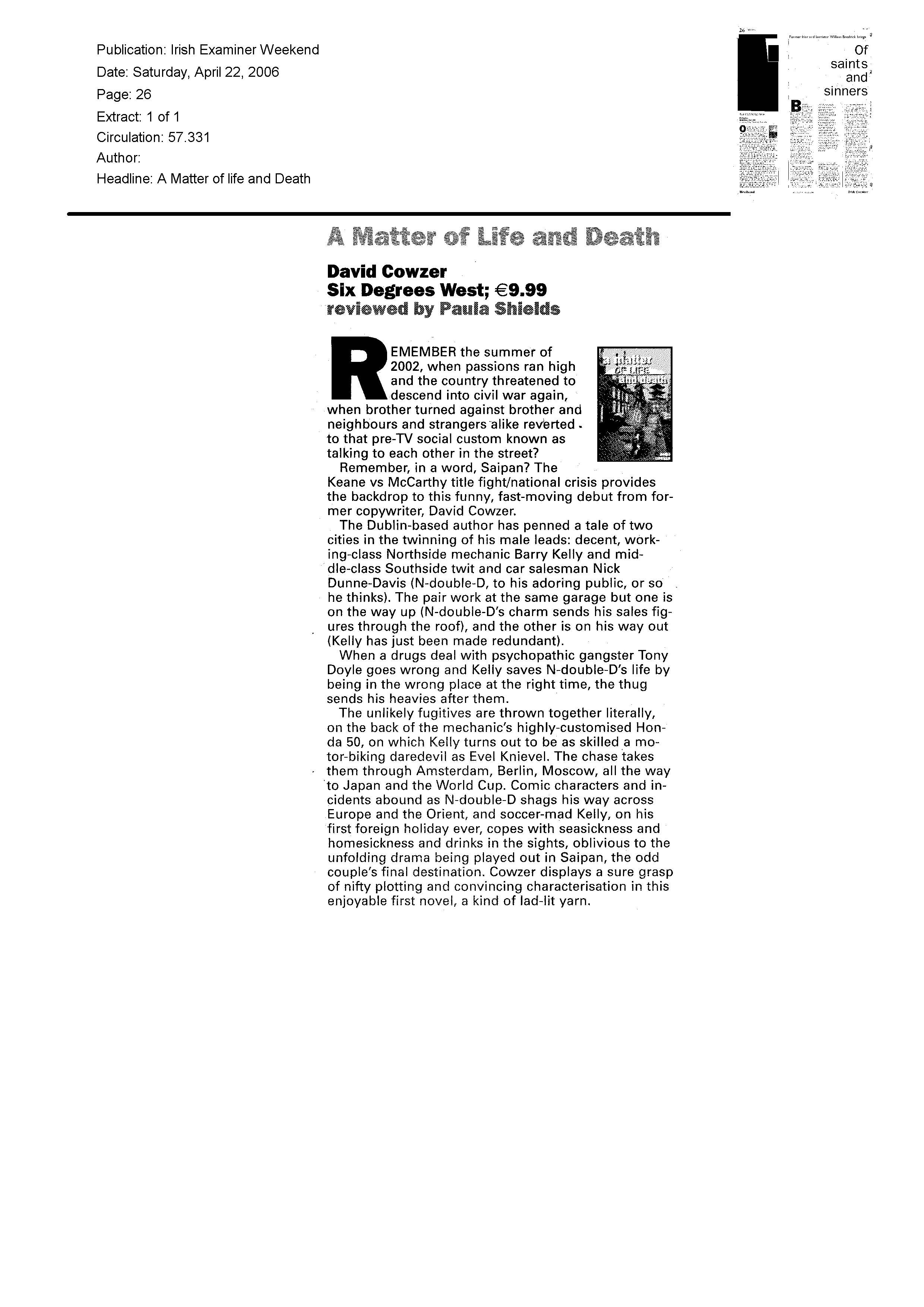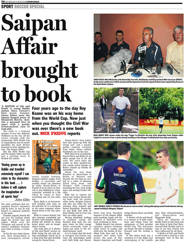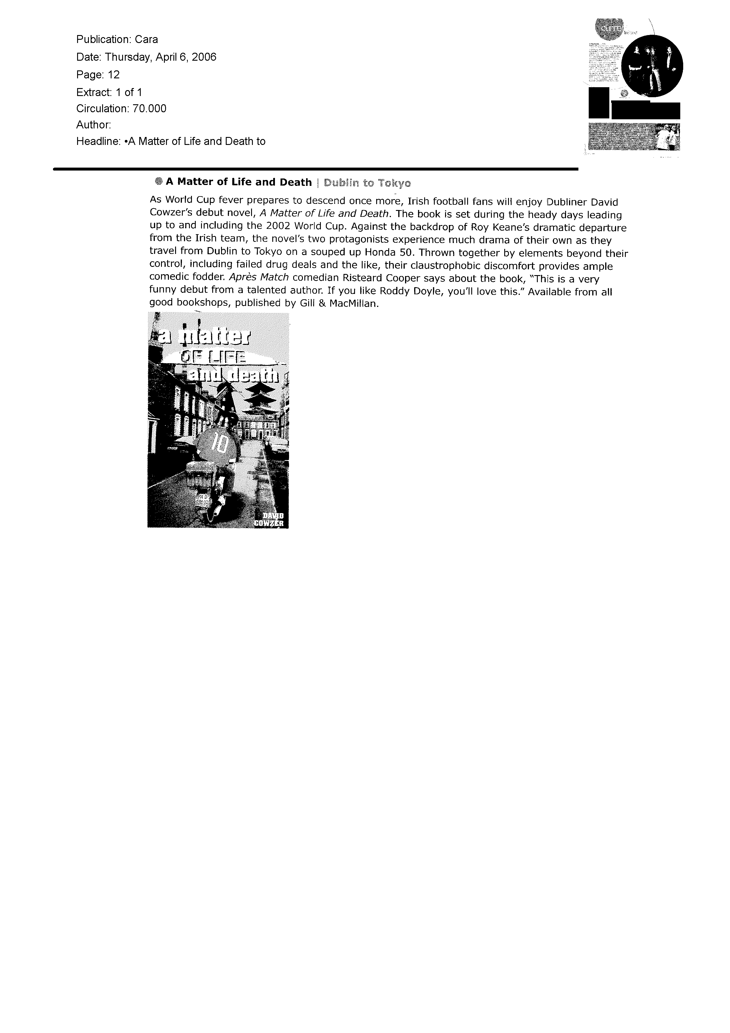With the World Cup in full swing, David Cowzer's first novel A Matter of Life and Death is released just in time to relive Irelands glories in Japan four years ago, as a way to console ourselves over the fact that we didnt qualify this year. But this book isnt just about the highs and lows of the World Cup; in fact, that only plays a small part in what is a high speed dash half way across the world on the trail of gangsters, smuggled cocaine and a passage home. The book introduces us to the world of Nick Dunne Davis, an obnoxious garage owner and small time cocaine supplier. When a shipment of cocaine goes missing, Tony Doyle, one of Dublins toughest gangsters, sends his associates around to the garage to have a word with Nick. As luck would have it, his mechanic Barry turns up at just the right moment to get him out of trouble.